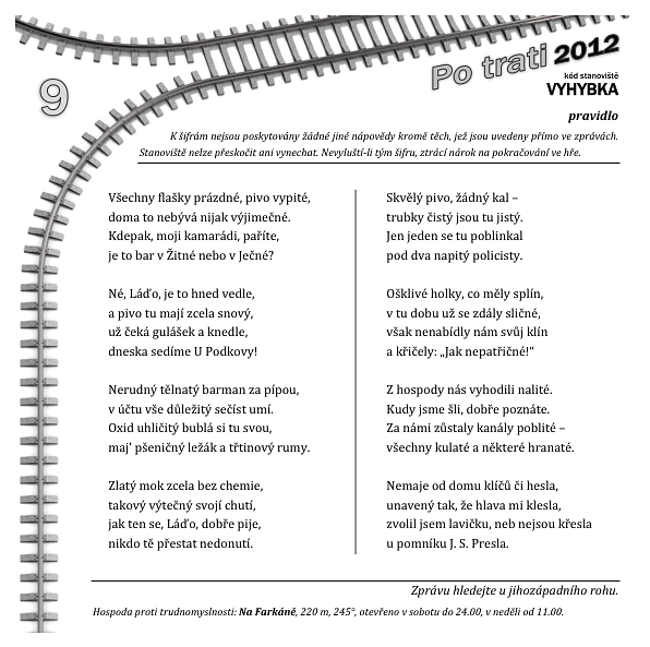 Báseň obsahuje slova zakončená různými tvary (rod a číslo) koncovek využívaných v českém chemickém názvosloví oxidů, které lze očíslovat podle valence prvku sloučeného s kyslíkem I–VIII. Oxidační čísla příslušných koncovek (včetně koncovek zbavených diakritik) sečtena v rámci sloky dávají po převedení na písmena řešení.