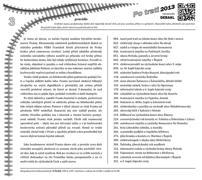 V seznamu šifer se skrývají dvě nápovědy. V počátečních písmenech míst stojí: „tento seznam mist neobsahuje šifru“. A rozdíly mezi čísly stanovišť (počet dní, po které Franta na místě pobýval) po převedení na písmena dávají: „reseni pomuze mapa blizkeho okoli“.