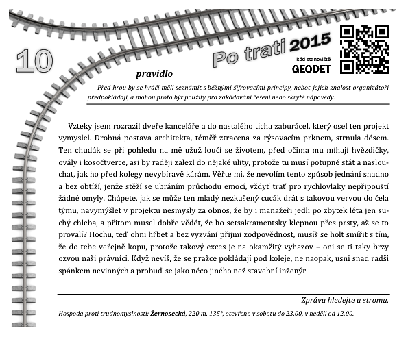 Fakt velmi pěkná šifra. Týmově jsme se docela zapotili tam všechny ty slova "podstatné jméno-sloveso" najít. Ze začátku jsme jich měli tak polovinu a samozřejmě nám to nic nedávalo, tak už jsme hledali i jiné možnosti. Naštěstí pak Zuzka našla několik dalších a najednou tam ta dvojkovka byla.