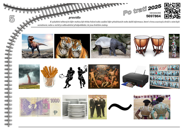 Na každém obrázku je objekt (přípaně objekty), který začíná písmeny ten, ta, to, ti, nebo ty a současně lze na objekt(y) ukázat jedním z těchto zájmen. Očíslujeme-li zájmena po řadě 1–5, udává obrázek dvě souřadnice pole ve čtverci 5×5, a vybírá tedy písmeno z permutovaného Polybiova čtverce vytvořeného v šifře 4. Tato písmena čtena v pořadí obrázků dávají řešení.